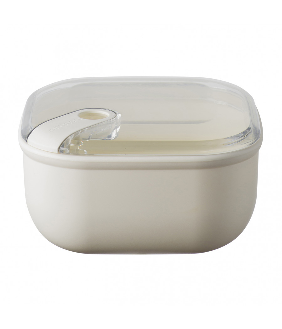 Il design quadrato permette di occupare tutto lo spazio disponibile e il coperchio trasparente agevola il riconoscimento del cibo all’interno senza dover aprire il contenitore.